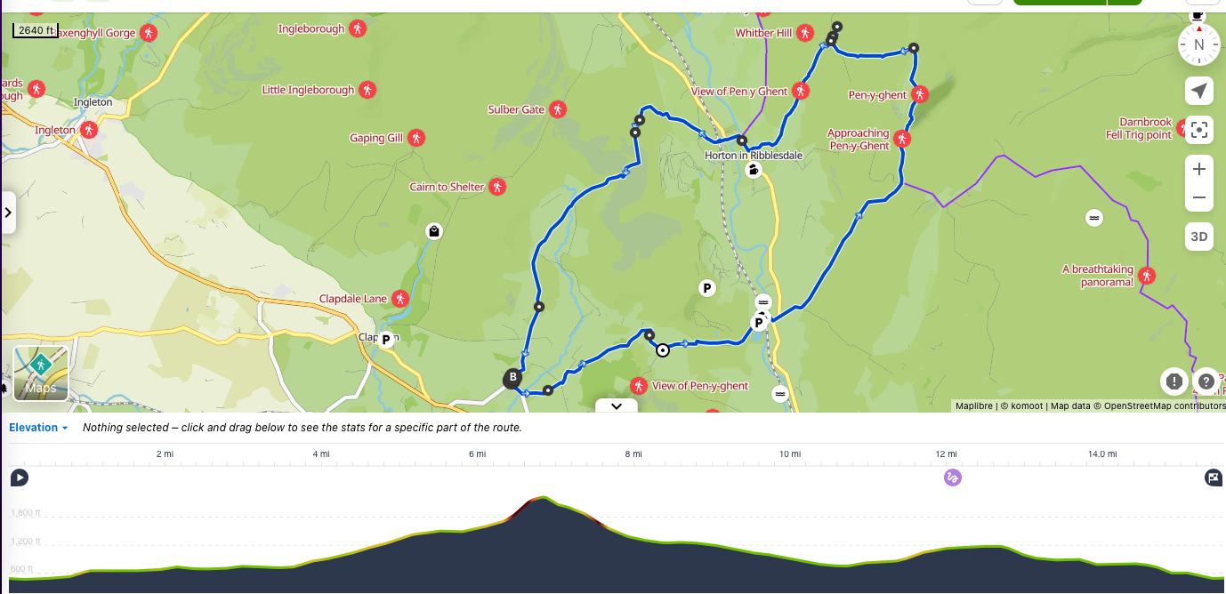 | Equipment | Good boots, those are essential for the muddy Parts in the fields as well as the rocky section of Pen-y-Ghent. Plenty of layers, the weather can be mild in the valley but very windy and chilly at The top. A map or GPS. Plenty of water and snacks to sustain you through c. 5 hours of Exercise. |